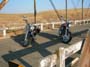 June 28, 2003 All Photos | To The Coast & Back My friend Darrell saddled up the 84 V65 Magna and I rode the '03. With the bikes outfitted for a possible two day, we headed out of Modesto on Crowslanding road at about 9:00am in the Ponch & John configuration (side-by-side). It was a gorgeous day. We cruised through the west side farmland to the I5 where we went south, to Santa Nella (fueled). We crossed the Pachaeo Pass on the 152, and veered left at the 156 and passed through Hollister. We went south a few miles on the 101 when we reached it, then headed west again when the we found the 156 portion heading for the coast. When we hit the town of Marina along the coast, we hit a cold fog bank. Since our plan was to cruise the 101, this was disappointing. But as we approached Monterey, the sun broke through and the beauty shined. We motored casually through Monterey and stopped for lunch just up from the Aquarium and Cannery Row at "Archies". A quiet, relaxing brunch on the porch in a cool sea breeze can't be beat. We then gripped the coastline down through Monterey and into Pebble Beach. We skipped the $8.50 per bike 17 mile drive (sheesh), and opted for Hwy 1. We took a side trip through Carmel By The Sea to see if Clint was home We put some more fuel into the ever empty '03. Then we took of down the beautiful coast run of Hwy 1 with its views and twisties. We immediately found the fog and cold again. But we were loving it anyway. We spent some time in turn outs doing the OhhAhh thing. After tight costal cliff turns, pine tree lined lanes as dense as cave walls, open meadows, hills of seaside scrub and quaint ocean views, we arrived in Cambria. After fueling up, we took a break for some grub at Round-Up pizza in the Hwy 1 Business area in the north of the "town". Darrell and I traded bikes at this point for something different (an to change seating positions). We took the pass between Cambria and Paso Robles. Half way between we drove into a wall of heat. The temp difference between the coast and the inland furnaces, I mean valleys, was instant. A change of 25 degrees in a few hundred feet. Once in Paso Robles we headed north on US101 for twenty miles to San Miguel where we left the beaten path for a trip into the Cholame Hills. After a quick top off of the tanks (this next leg was going to iffy for "services" for a while), and apply some more sunscreen, we weaved or way through tiny San Miguel and found (with some verbal assistance) Indian Hills Road - a road pretending to be two lanes. This lead off into the parched costal mountains. For being a tiny, narrow road in the middle of nowhere with no traffic - it was in good shape. It was amazing how desolate it can get in the middle of California. Darrell, leading, was on a killing rampage! Final totals - 4 squirrels, one bird in flight and he thought about taking out a BIG cow. During this leg we came across a huge canyon in this back country. Kinda surprising. We reached the end of Indian Hills Road and were dumped onto H198. 100 yards up the 198 was the start of the H25. This was a road made for motorcycling. We forced our fuel concerns out of our minds and took off down the 25. Nice wide lanes (only 2), excellent (recent) paving, virtually no traffic and lots and lots of turns of various diameter, angle, combinations, elevations. I'm sure there was great scenery, but I saw none of it. I was fully focused on the ride. Great motoring experience. As we coasted into the first gas station we'd seen in 96 miles, Darrell ran out on '03. After fueling up, we took a leisurely trip into Hollister for some Ice Cream (and settled for McDonalds McFrozen Goopy Stuff with chunky junk mixed in) and a half our break to rest our, ah, saddle sore rumps. We saw Corbin as we left town (they were closed) The final run was back over Pacheaco Pass on H152. We passed the I5 and toured through Los Banos. Then a left at the 59 up into Merced. We wrapped it up Merced at about 9:00pm - that's 12 hours of riding and just over 525 (hot, twisty) miles. Probably a little too much for one day. | |